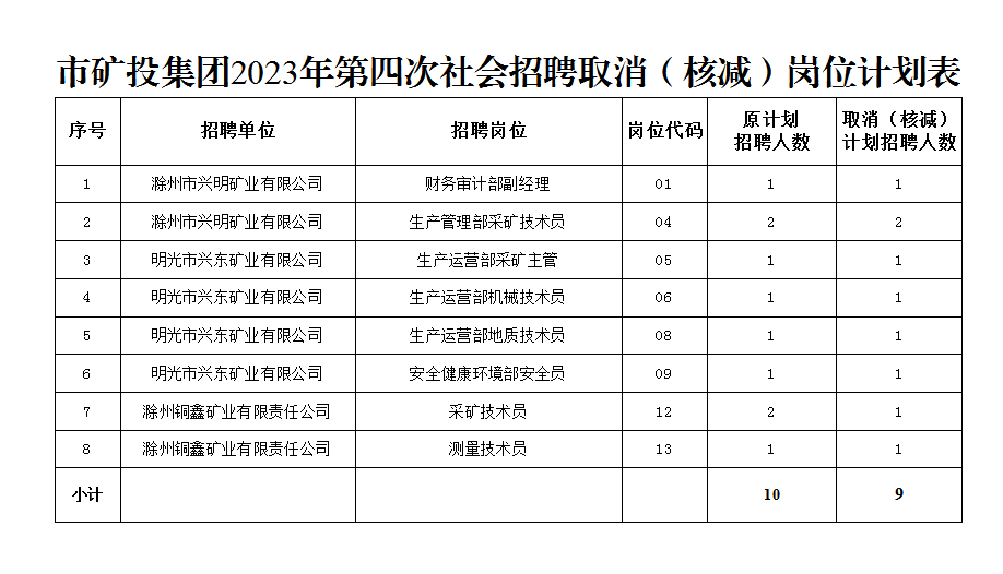 根據(jù)《滁州市興滁礦業(yè)投資集團有限公司2023年第四次社會招聘公告》規(guī)定,經(jīng)對各崗位報名情況篩查審定,結(jié)合資格復(fù)審情況,部分崗位報名情況未達到開考比例,經(jīng)研究決定取消(核減)以下崗位招聘計劃: