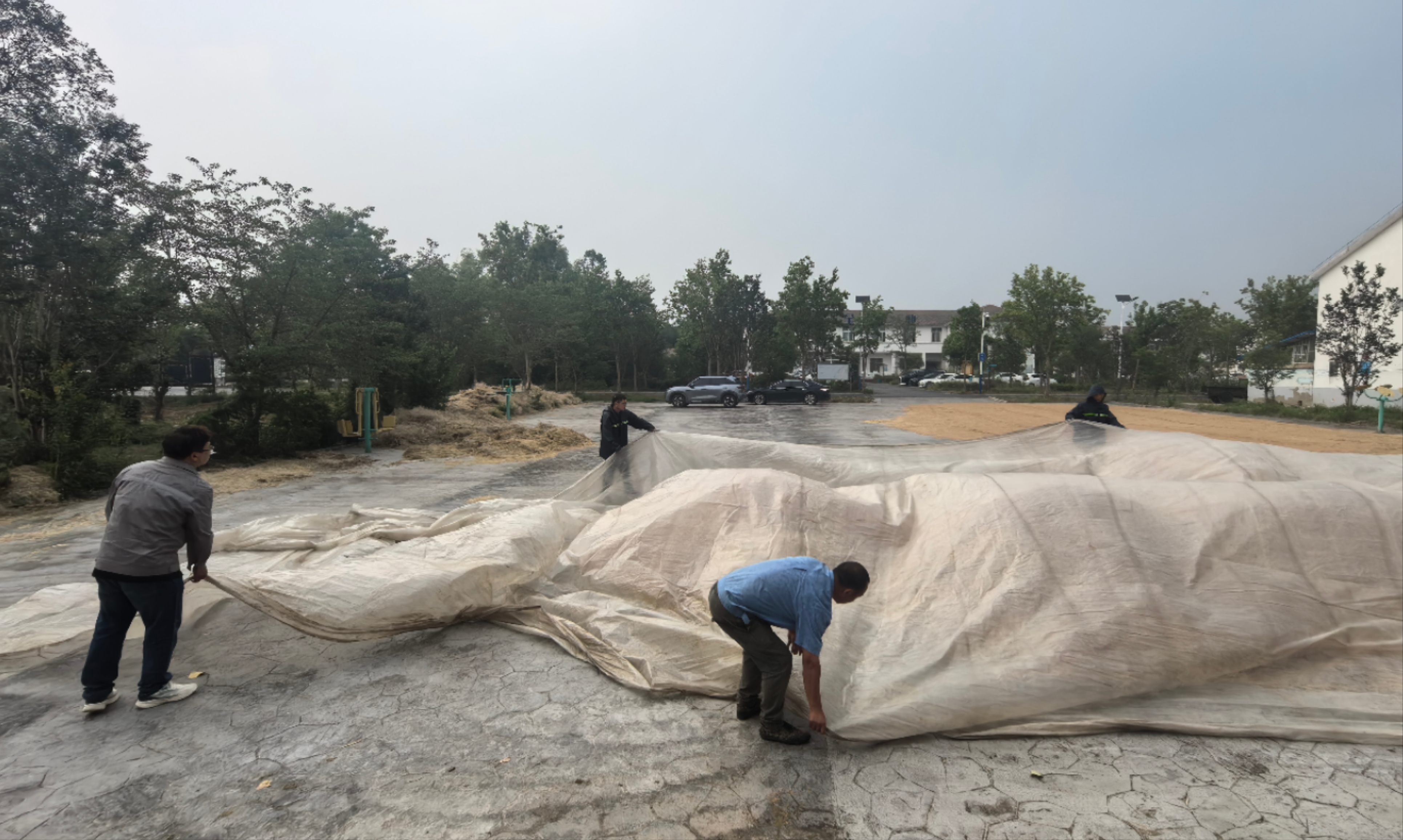志愿者們拿起推糧鏟、鐵鍬、大掃帚,對糧堆邊緣散落的小麥進行集中歸攏,并迅速用防水雨布對糧堆進行覆蓋,有效防止因雨水滲透導(dǎo)致的糧食霉變損耗風(fēng)險。